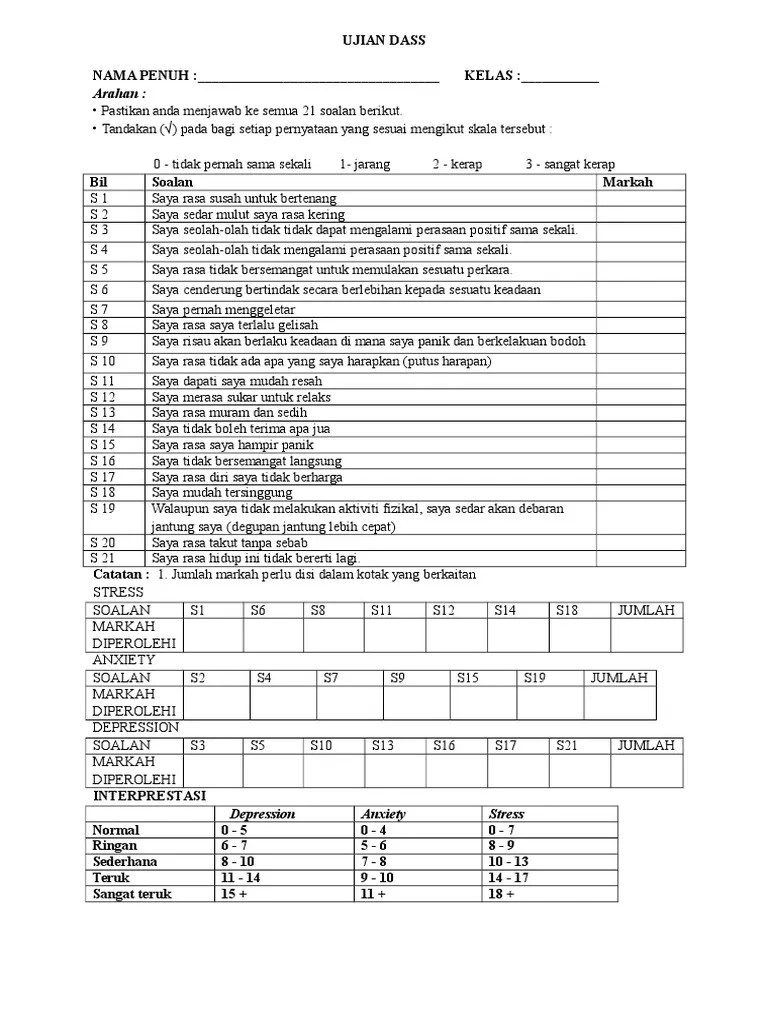 Ujian Dass Online. Konseling · konseling pasangan · workshop · webinar · bootcamp · kelas online · mental health training · gift card · youtube membership · tes psikologi. Depression anxiety stress scale 21 bahasa malaysia. Saringan minda sihat jabatan kesihatan negeri johor. Ianya masih diperingkat saringan dan dengan itu, pengesahan diagnosa oleh pegawai perubatan masih diperlukan.