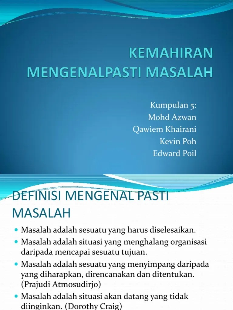 Mengenal Pasti Masalah. Masalah definisi mengenal pasti masalah: Al.(2010) mengemukakan 4kumpulan permasalahan klien yang biasadialami klien;1.masalah psikologi2.akademik & pengurusan diri3.masalah pemikiran4. Apakah fokus yang menjadi keutamaannya? Masalah adalah sesuatu yang mesti diselesaikan. Kami gembira mengetahui anda telah menyelesaikan masalah tersebut. Mengenal pasti masalah, menyenaraikan pilihan, menilai penyelesaian .