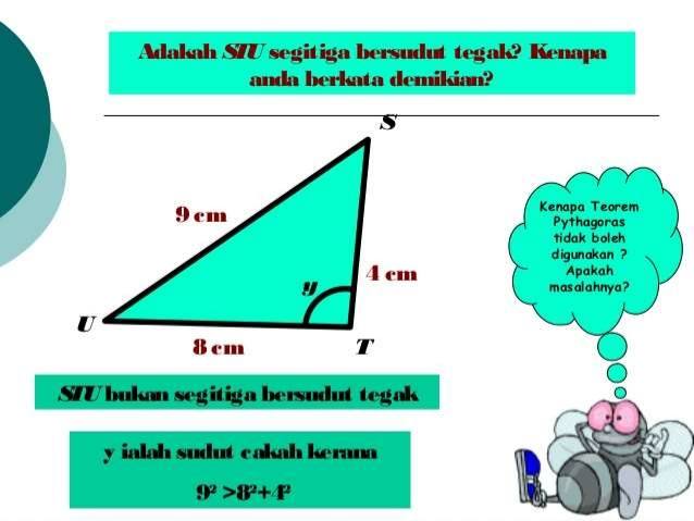 Jika data ini tidak diketahui dalam soal, . Tinggi segitiga dapat ditemukan dengan menggambar garis tegak lurus dari alas ke puncak yang berseberangan. Sisi di depan sudut 90o disebut hipotenus. Mengenal dan menamakan sudut tegak sudut tirus dan sudut cakah pada bentuk segiempat tepat segiempat sama dan segitiga.